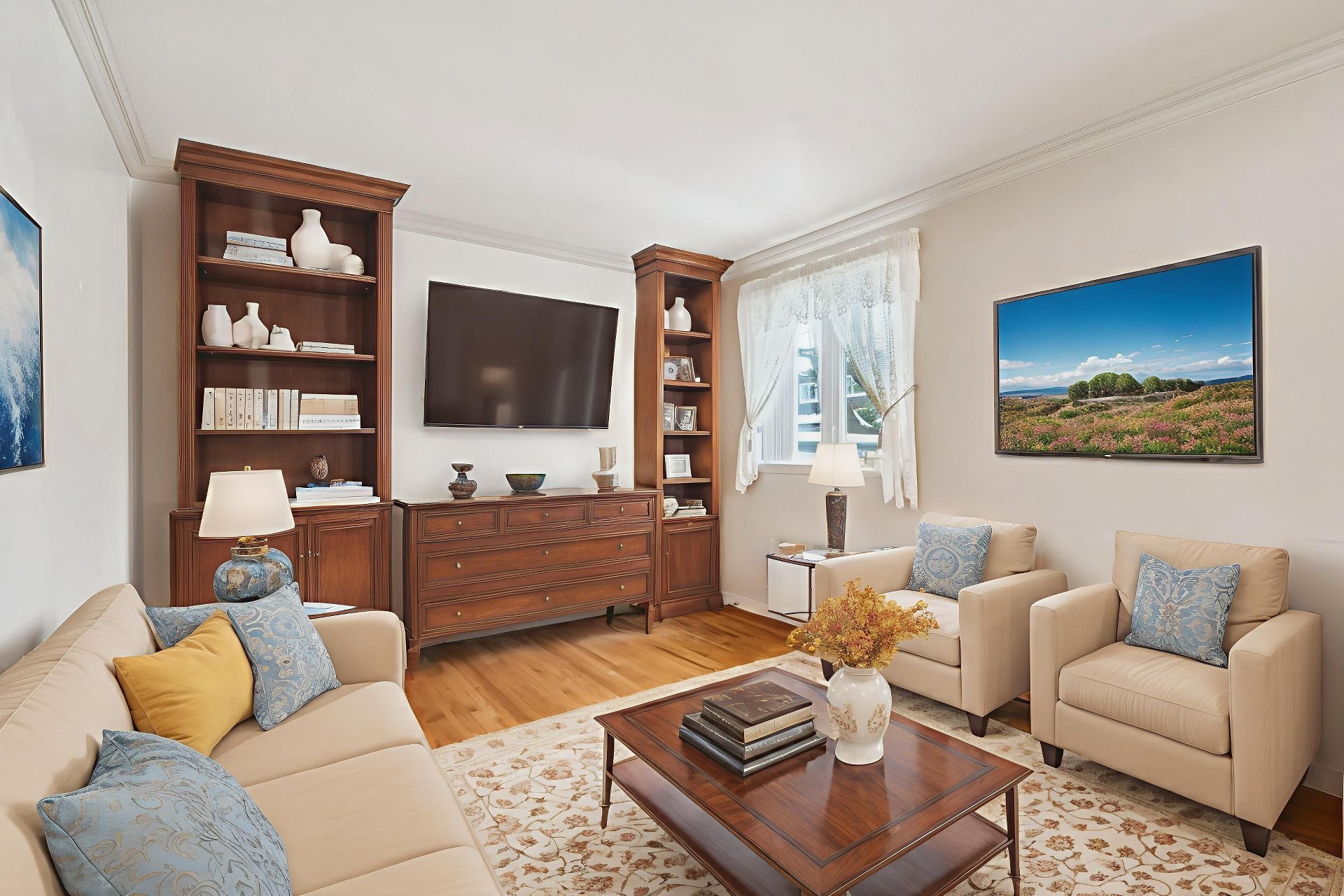 Rideaux et tringles, les stores, lave-vaisselle (défectueux), l'air climatisé mural.